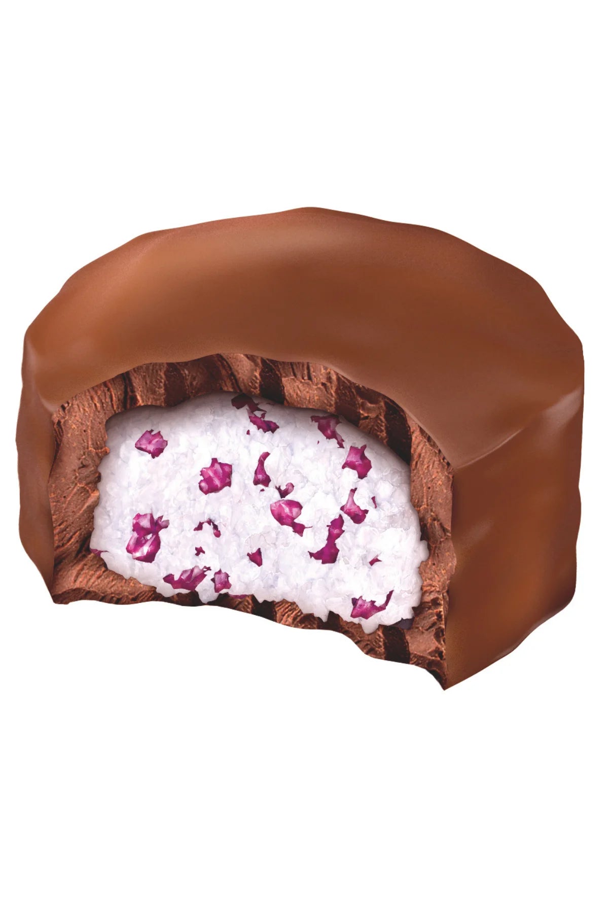 Creamy coconut filling with strawberry and banana pieces, enrobed in smooth milk chocolate—an ideal sweet treat for any moment.